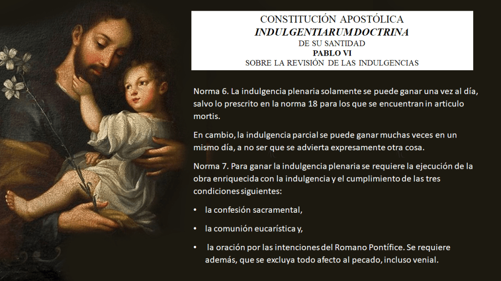 La indulgencia plenaria se concede en las condiciones habituales (confesión sacramental, comunión eucarística y oración según las intenciones del Santo Padre) a los fieles que, con espíritu desprendido de cualquier pecado, participen en el Año de San José en las ocasiones y en el modo indicado por esta Penitenciaría Apostólica.