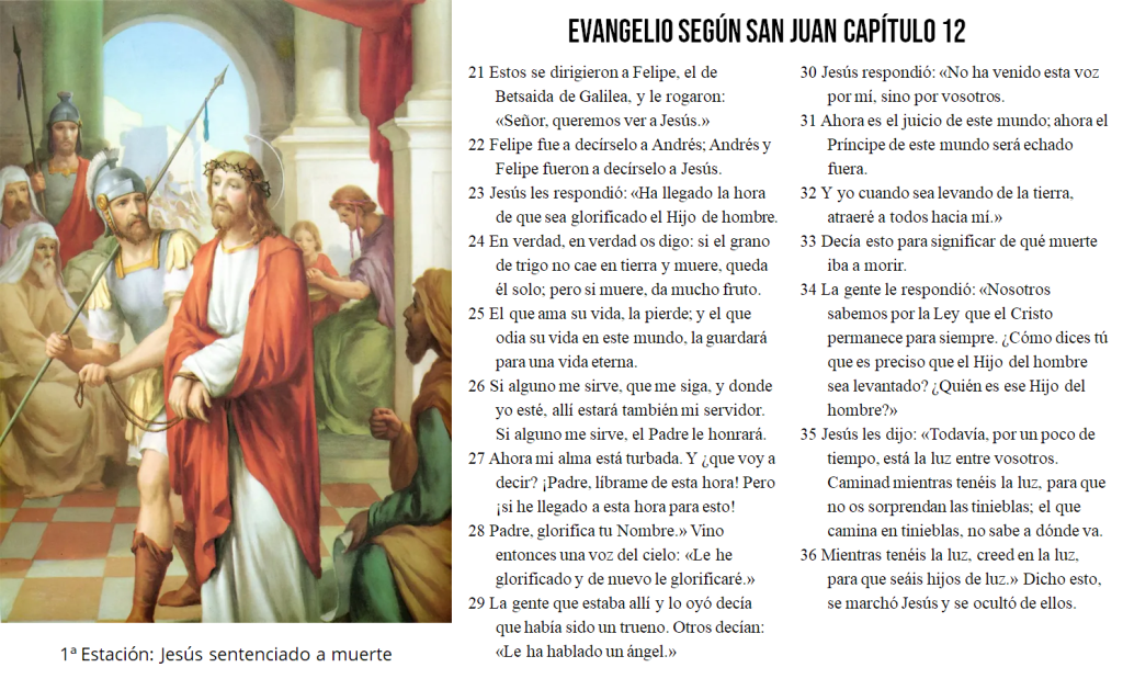 En preparación de la Semana Santa hemos realizado este ejercicio de meditación anclado en el Via Crucis. Pero, como verán no estas explicando las estaciones del Via Crucis. Al lado de cada Estación hemos colocado un texto de los Evangelios que nos permite conocer la causa, motivo y fin de este Via Crucis que no es otra que la instauración de Alianza Nueva y Eterna. Con estos textos se puede entender la disputa entre los sacerdotes de la antigua alianza que a partir de esta nueva alianza ya existe un nuevo nivel en la historia de la Salvación. En esta alianza nueva y eterna el Hombre es redimido totalmente y puede optar, no por mérito propio sino por los méritos de la sangre derramada en la Cruz, a la vida eterna.