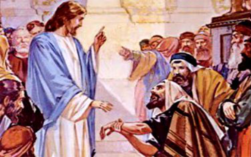 dice al hombre: «Extiende la mano.» El la extendió y quedó restablecida su