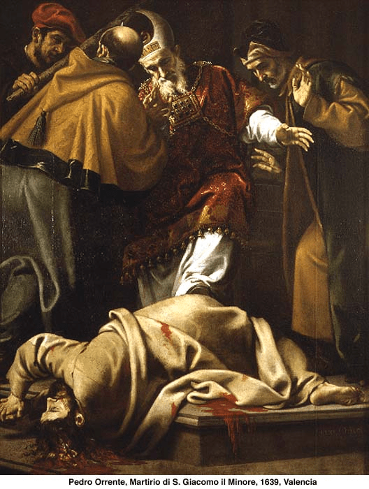 La tradición dice sobre su muerte que el sumo sacerdote Anás II le ordenó renegar de Jesús, pero Santiago, que estaba en lo alto del templo, aprovechando la concurrencia se puso a predicar el Evangelio. Al escuchar esto los fariseos y escribas se llenaron de furor y uno de ellos lo empujó desde lo alto. Santiago no muere de golpe, sino que es apedreado mientras rogaba a Dios de rodillas por sus asesinos. Como tardaba en morir, es golpeado en la cabeza con una maza por un batanero.