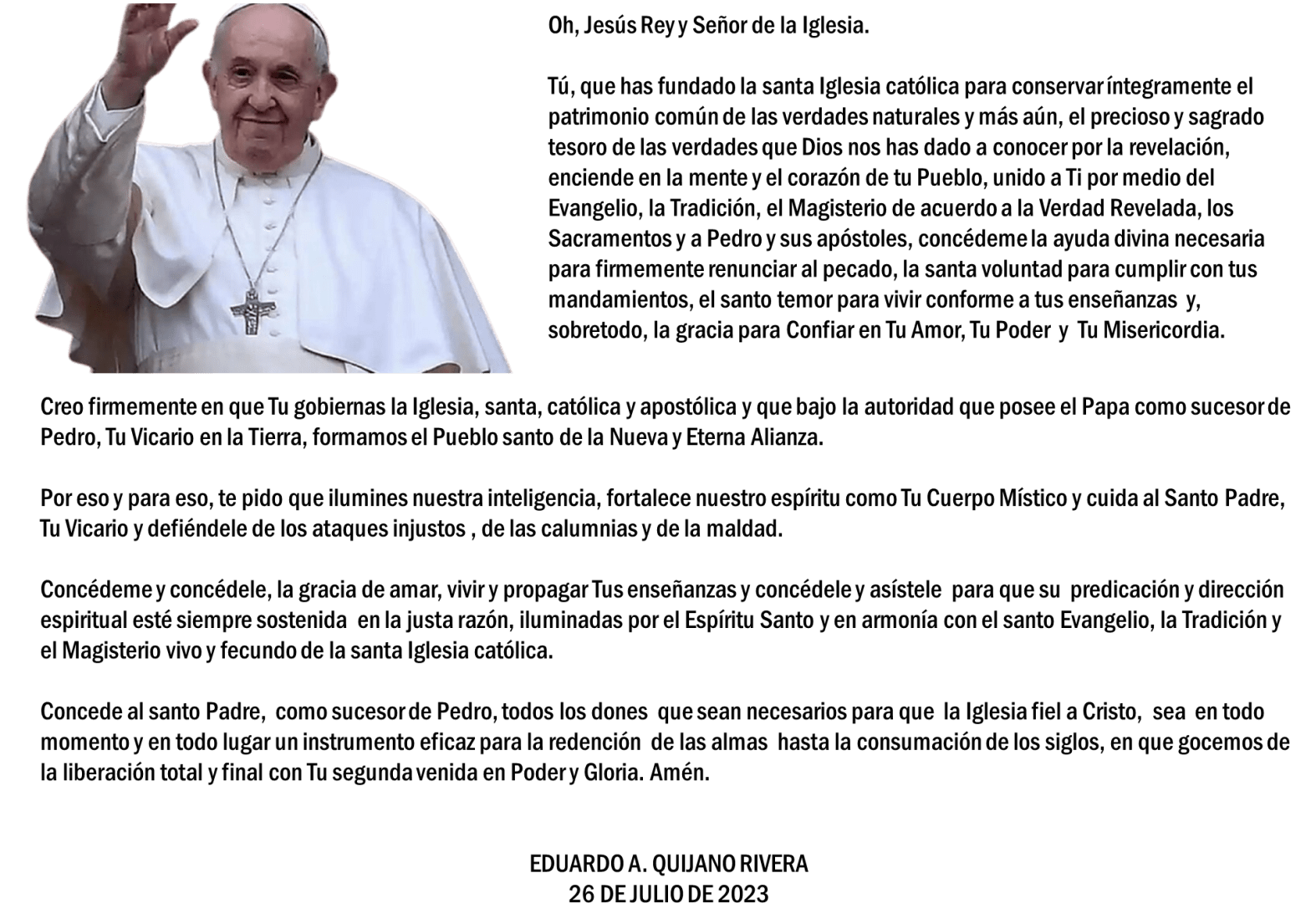 Oh, Jesús Rey y Señor de la Iglesia. Tú, que has fundado la santa Iglesia católica para conservar íntegramente el patrimonio común de las verdades naturales y más aún, el precioso y sagrado tesoro de las verdades que Dios nos has dado a conocer por medio de la Revelación, enciende en la mente y elContinue reading “ORACIÓN POR EL PAPA”
